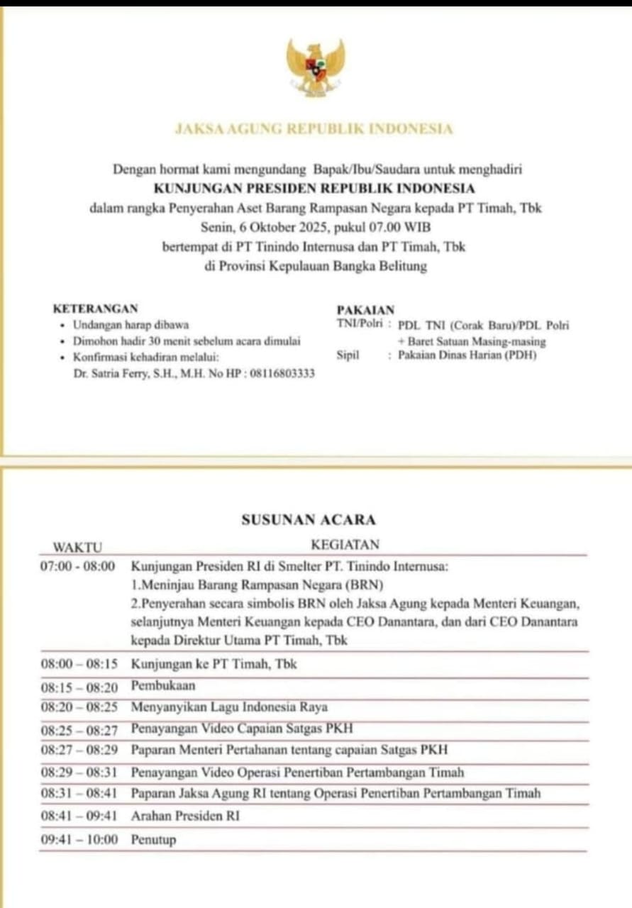 Presiden Republik Indonesia Bapak, Prabowo Subianto dijadwalkan melakukan kunjungan kerja ke Provinsi Kepulauan Bangka Belitung (Babel) pada Senin, 6 Oktober 2025. Salah satu agenda utama dalam kunjungan ini adalah menyaksikan secara langsung Penyerahan perampasan aset negara kepada PT Timah Tbk.(06/10/2025).