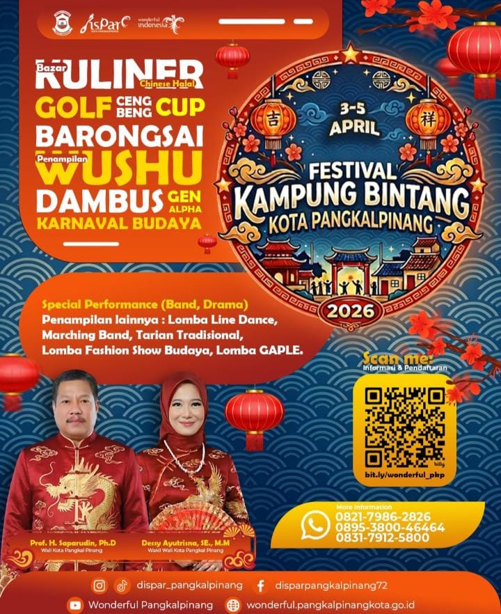 Dinas Pariwisata Kota Pangkalpinang akan menyelenggarakan Festival Kampung Bintang pada 3 hingga 5 April 2026 mendatang. Event ini akan dipusatkan di kawasan Kampung Bintang dan digelar secara meriah selama beberapa hari dengan menghadirkan beragam atraksi budaya, hiburan, hingga perlombaan.