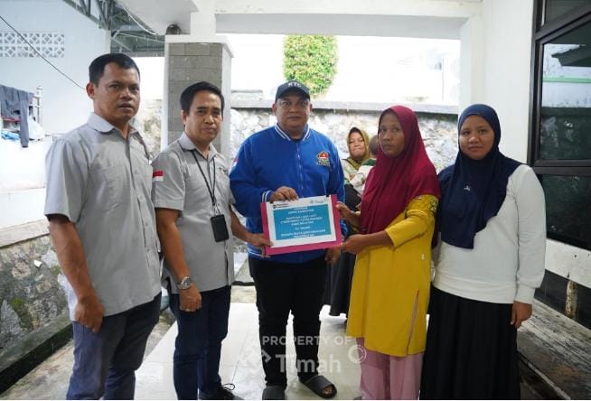 Bantuan dari PT TIMAH Tbk ini diserahkan langsung oleh Departement Head TJSL PT TIMAH Tbk, Risal Barung Mangontan kepada Winda (37) Ibu Baharudin yang turut disaksikan Ketua DPC HNSI Kabupaten Bangka, Slamet Riyadi, Rabu (10/12/2025),